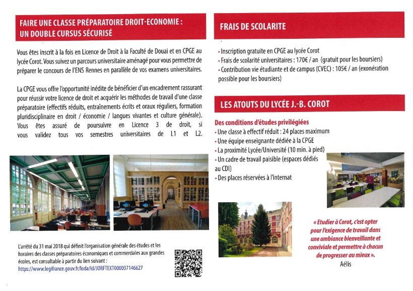 La classe Préparatoire Droit-Économie-Gestion est une formation « sécurisée » : L'étudiant est inscrit en double cursus à la faculté de droit de Douai de l'Université d'Artois en Première année de Licence de droit et en classe préparatoire au lycée Corot de Douai (à l'internat ou à l'externat selon le choix de l'étudiant).