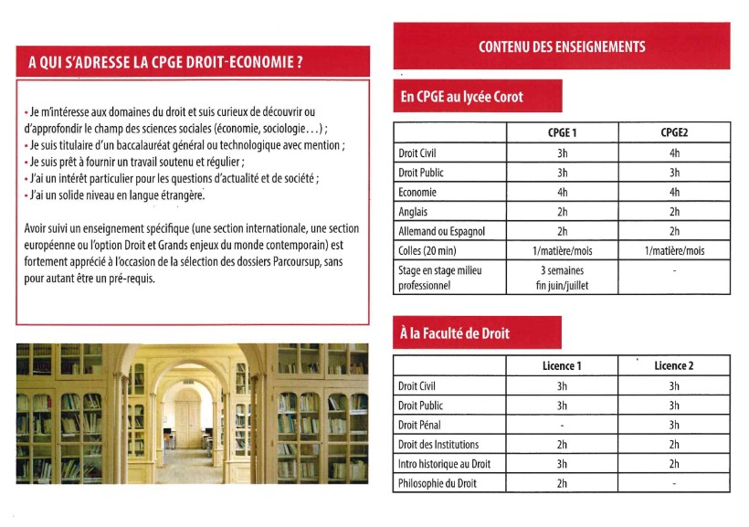 Depuis la rentrée 2024-2025, le lycée Corot propose une formation en Classe Préparatoire Droit Économie Gestion (D1).