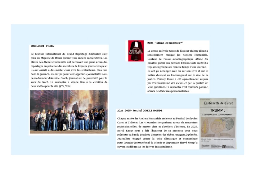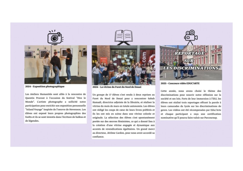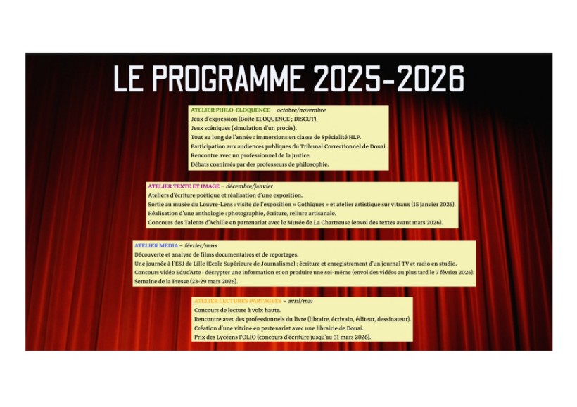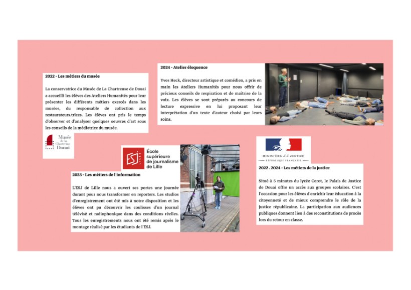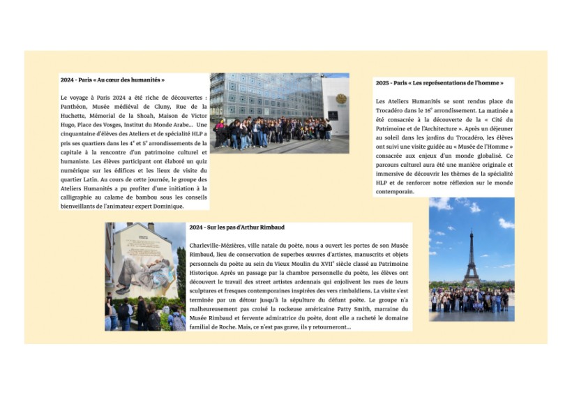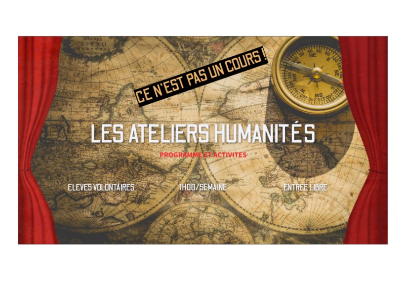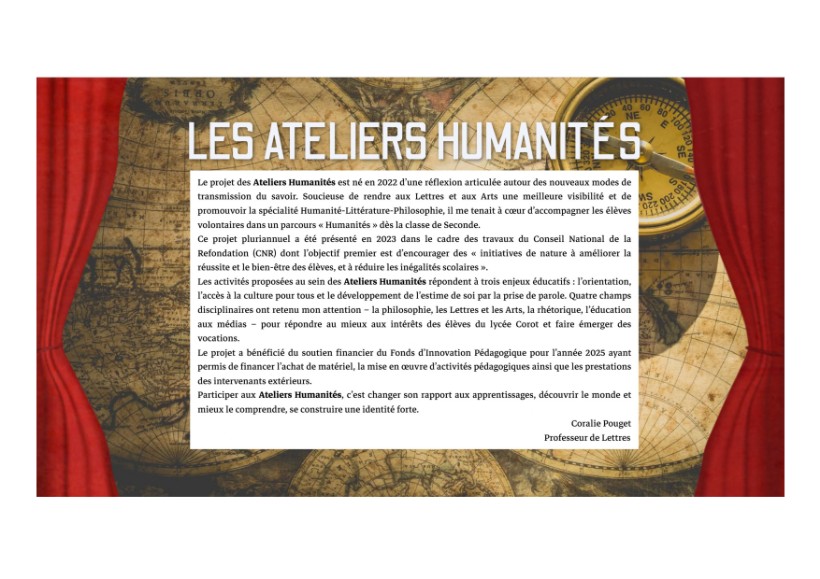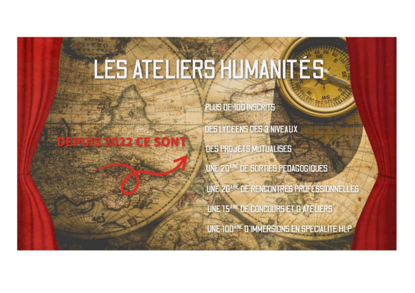 Madame Pouget, professeure de Lettres, a instauré des « Ateliers Humanités » visant divers objectifs tels que la découverte de la spécialité « Humanités, Littérature et Philosophie » (HLP), l’ouverture culturelle, l'encouragement à penser autrement, le renforcement de la confiance en soi...