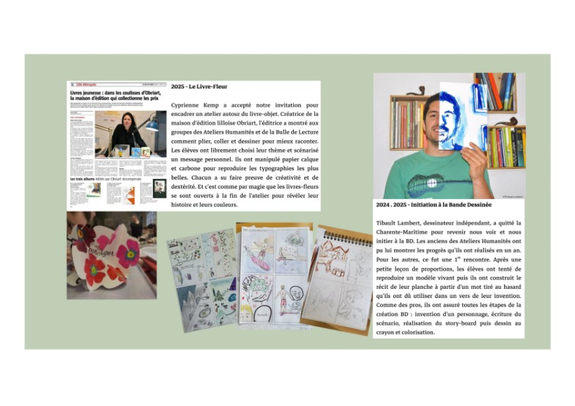 Les Ateliers Humanités invitent les élèves à découvrir les filières littéraires et artistiques autour d’activités collectives ludiques et de sorties pédagogiques tout au long de l’année. En plus de les accompagner dans leurs choix d’orientation, Madame Pouget propose aux lycéens de rencontrer des professionnels qui leur font découvrir et pratiquer leur métier.